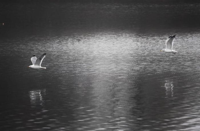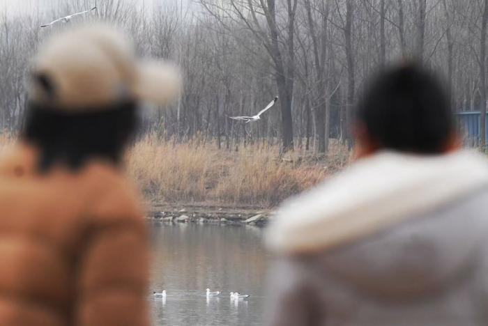 市民在岸边观看红嘴鸥飞行。