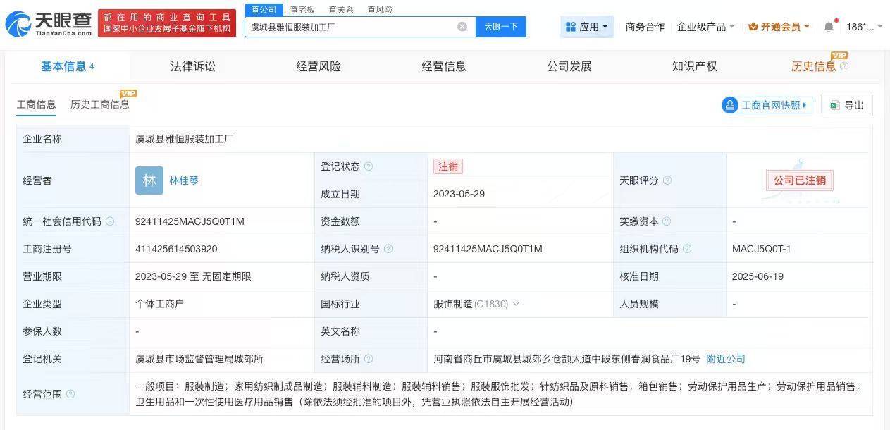 另一家遭315晚会曝光的虞城县雅恒服装加工厂成立于2023年5月,经营者为林桂琴,企业类型为个体工商户在线配资机构,经营范围包括服装制造、家用纺织制成品制造、卫生用品和一次性使用医疗用品销售等。目前该企业已注销。