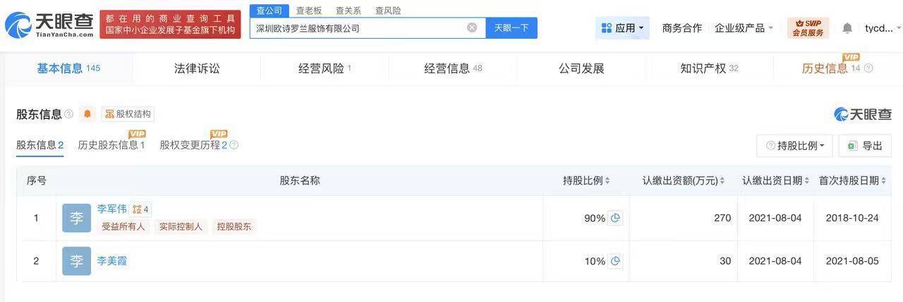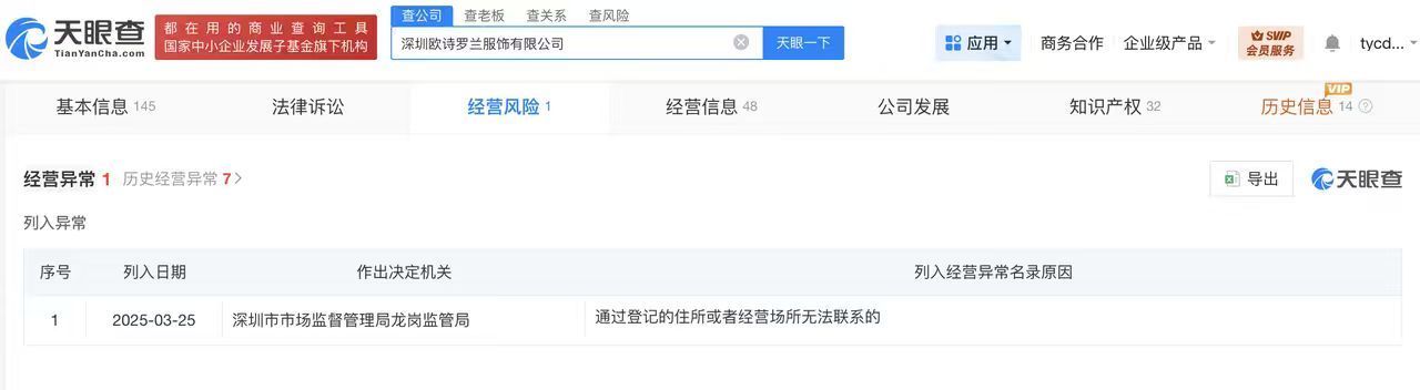 天眼查工商信息显示,遭315晚会曝光的深圳欧诗罗兰服饰有限公司成立于2018年10月,法定代表人为李军伟,注册资本300万人民币,经营范围包括女士内衣、男士内衣、纺织品、针织品等。股东信息显示,该公司由李军伟、李美霞共同持股。风险信息显示,2025年3月,该公司因通过登记的住所或经营场所无法联系被列入经营异常名录。