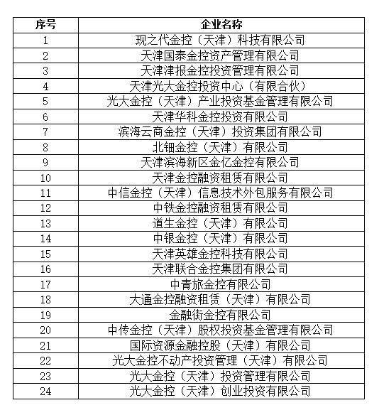 天津市未经批准使用“金融控股”等字样及名称中含有“金控”字样经营主体名单如下: