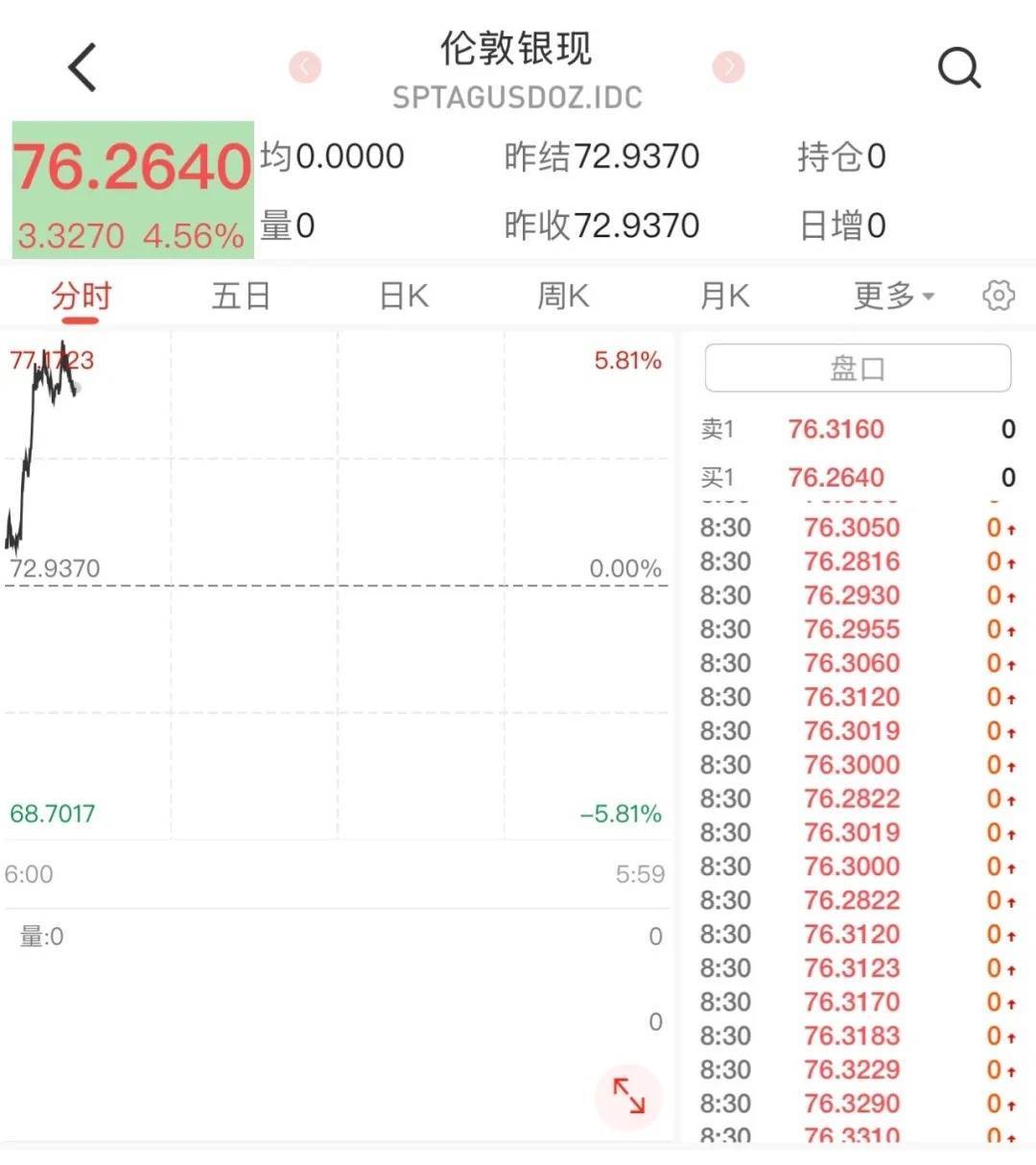伦敦银现价格日内上涨4.56%,报76.264美元/盎司。