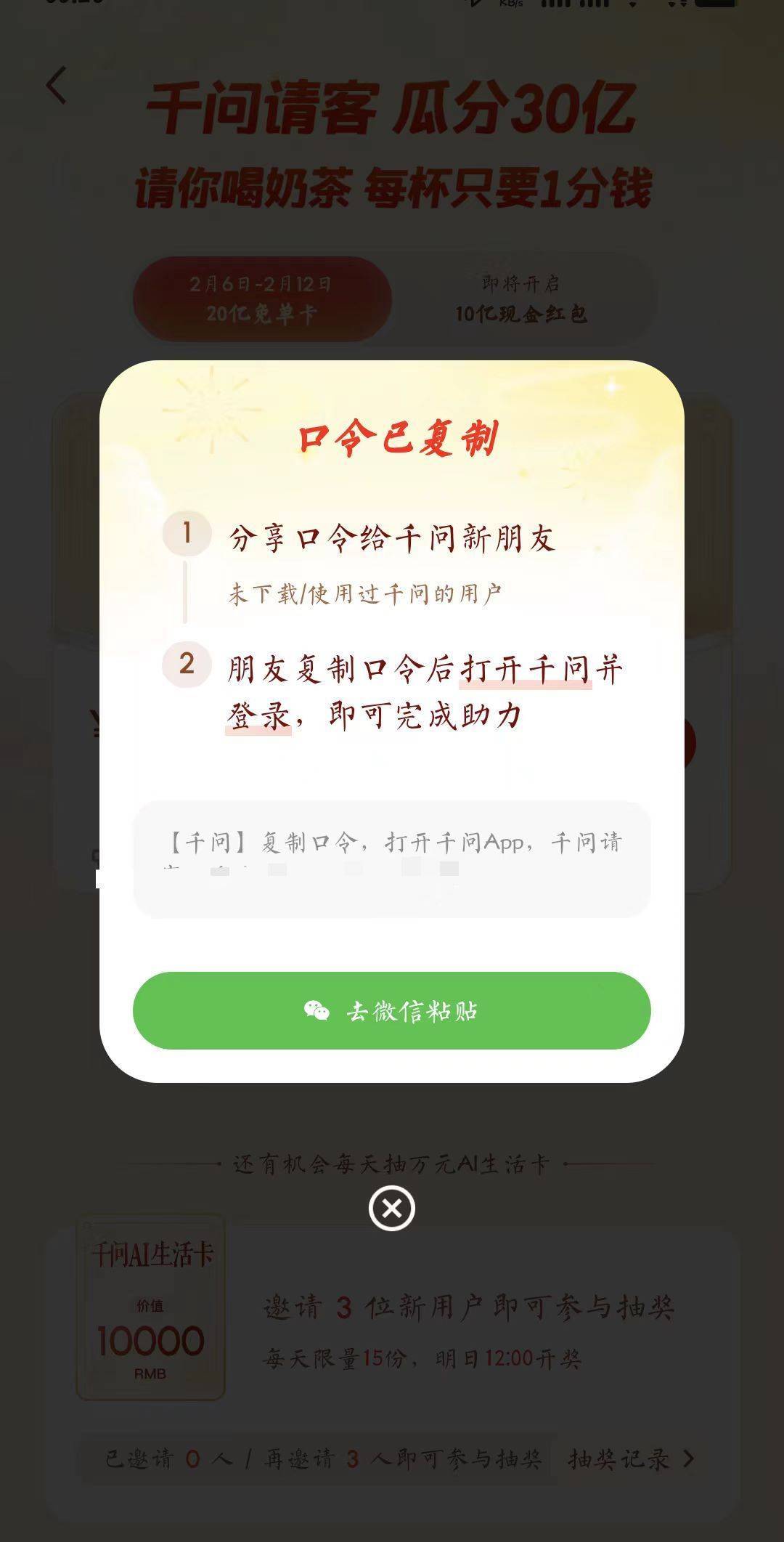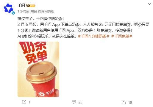 2月6日,千问正式上线“春节30亿免单”,用户使用千问App下单点奶茶,可得25元无门槛免单券,奶茶只要1分钱。此外,邀请新用户使用千问App,双方各得1张免单券。