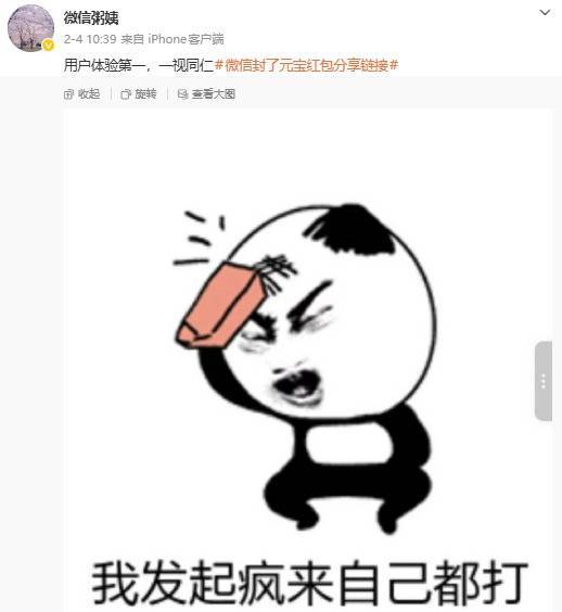 认证为微信公关总监的账号“微信粥姨”也发微博称,用户体验第一,一视同仁,并配图“我发起疯来自己都打”。